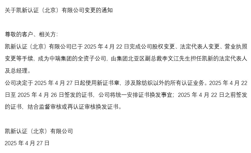 2025.07.02凱新認(rèn)證(北京)有限公司順利通過(guò)ANAB FSSC 22000食品安全體系現(xiàn)場(chǎng)見(jiàn)證評(píng)審凱新認(rèn)證(北京)有限公司(以下簡(jiǎn)稱(chēng)“凱新認(rèn)證”)成功通過(guò)美國(guó)國(guó)家認(rèn)可委員會(huì)(ANAB)對(duì)FSSC 22000食品安全管理體系的現(xiàn)場(chǎng)見(jiàn)證評(píng)審,并以零不符合的卓越表現(xiàn),彰顯其行業(yè)實(shí)力與專(zhuān)業(yè)水準(zhǔn)。2025.04.27關(guān)于凱新認(rèn)證(北京)有限公司變更的通知尊敬的客戶(hù)、相關(guān)方: 凱新認(rèn)證(北京)有限公司已于2025年4月22日完成公司股權(quán)變更、法定代表人變更、營(yíng)業(yè)執(zhí)照變更等手續(xù),成為中瑞集團(tuán)的全資子公司,由集團(tuán)北亞區(qū)副總裁李文江先生擔(dān)任凱新的法定代表人及總經(jīng)理。2025.03.28關(guān)于ISO/IEC 27006-1:2024(CNAS-CC170:2024)認(rèn)證標(biāo)準(zhǔn)換版工作安排的公告國(guó)際標(biāo)準(zhǔn)化組織(ISO)于2024年3月發(fā)布ISO/IEC 27006-1:2024《信息安全、網(wǎng)絡(luò)安全和隱私保護(hù) 信息安全管理體系審核和認(rèn)證機(jī)構(gòu)認(rèn)證機(jī)構(gòu)要求 第1部分:通用》,該標(biāo)準(zhǔn)替代了ISO/IEC 27006:2015及其相應(yīng)的修改單。國(guó)際認(rèn)可論壇(IAF)于2024年5月發(fā)布強(qiáng)制性文件IAF MD29:2024《ISO/IEC 27006-1:2024轉(zhuǎn)換要求》(第1版),提出了本次轉(zhuǎn)換周期,并規(guī)定了IAF成員認(rèn)可和認(rèn)證機(jī)構(gòu)的標(biāo)準(zhǔn)轉(zhuǎn)換要求。2025.02.25關(guān)于凱新認(rèn)證啟用電子證書(shū)的通知為貫徹落實(shí)國(guó)家關(guān)于加快推進(jìn)電子證照擴(kuò)大應(yīng)用領(lǐng)域的相關(guān)政策要求,進(jìn)一步提升認(rèn)證證書(shū)的管理效率,優(yōu)化客戶(hù)服務(wù)體驗(yàn),凱新認(rèn)證(北京)有限公司將全面啟用電子證書(shū)。現(xiàn)將有關(guān)事項(xiàng)通知如下